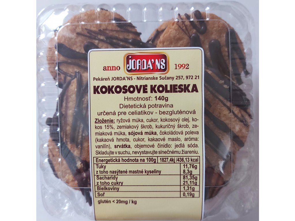 Zloženie: ryžová múka, cukor, kokosový olej, kokos 15%, zemiakový škrob, kukuričný škrob, zemiaková múka , sójová múka, čokoládová poleva ( kakaová hmota, cukor, kakaové maslo, aróma: vanilín , emulgátor: slnečnicový lecitín), srvátka, objemové činidlo: jedlá sóda
