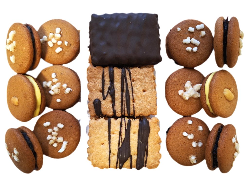 Zloženie: ryžová múka, cukor,zemiakový škrob, kukuričný škrob, zemiaková múka, kokos, slivkový lekvár ( slivkový pretlak (63%), jablčný pretlak (21%), cukor,glukózovo-fruktózový sirup, karamelizovaný cukor, zahusťovadlo: xantán, regulátor kyslosti: kyselina citrónová ), glukóza, úplne hydrogénovaný rastlinný olej kokosový, tmavá poleva ( cukor, úplne hydrogénovaný rastlinný tuk kokosový, kakaový prášok so zníženým obsahom tuku (16%), emulgátor: slnečnicový lecitín, aróma: vanilín ), lieskovo-oriešková náplň ( cukor, nehydrogenovaný rastlinný olej repkový, lieskové oriešky (8%), kakaový prášok so zníženým obsahom tuku, laktóza, kukuričný škrob, emulgátor: slnečnicový lecitín), citrónová náplň (cukor,nehydrogenovaný olej:slnečnicový, sójový,repkový,palmový, sušené odstredené mlieko 10%, sušená srvátka,laktóza, prírodné citrónové farbivo,emulgátor: sójový lecitín,prírodné farbivá karotény), vajcia, med 1% ,objemové činidlo: jedlá sóda, škorica, muškátový orech, koriander, zázvor, fenikel, klinček, nové korenie, aníz, badián, čierne korenie, kardamón, arašida